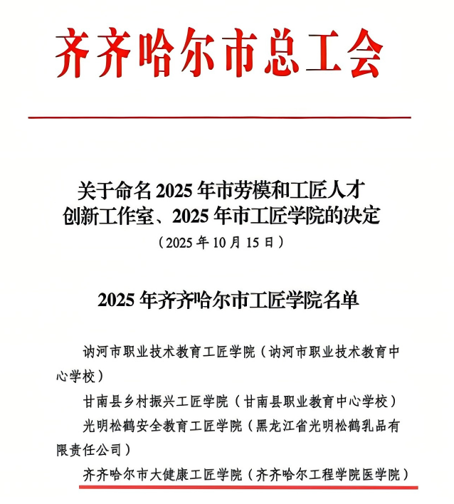 近日,齐齐哈尔市总工会印发《关于命名2025年市劳模和工匠人才创新工作室、2025年市工匠学院的决定》,我校医学院牵头申报的“齐齐哈尔市大健康工匠学院”成功入选2025年齐齐哈尔市工匠学院名单,成为全市4家市级工匠学院之一。